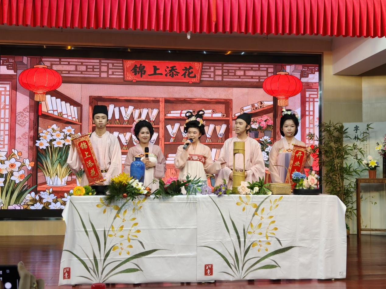 決賽現(xiàn)場,來自印尼、泰國、柬埔寨、馬來西亞、老撾、緬甸等國的20名華裔學(xué)子組成四支隊伍,圍繞“茶、花、香、畫”四大雅文化主題展開教學(xué)展示?!板\上添花”組以花藝傳遞生機(jī)與美好;“墨韻詩意”組融書法與古詩于一體,展現(xiàn)筆墨間的詩意雅趣;“馨香四域”組通過香道詮釋寧靜深邃的精神修養(yǎng);“茶觀東西”組則以茶為媒,串聯(lián)起跨文明對話。選手們依托生動的課堂設(shè)計、精美的課件教具與豐富的互動體驗,通過“講、看、聞、觸、體驗”等多維教學(xué)方式,讓傳統(tǒng)文化在課堂中鮮活呈現(xiàn),引領(lǐng)觀眾沉浸于一場場穿越古今的文化之旅,贏得現(xiàn)場陣陣掌聲。